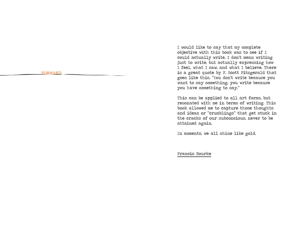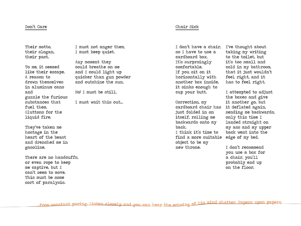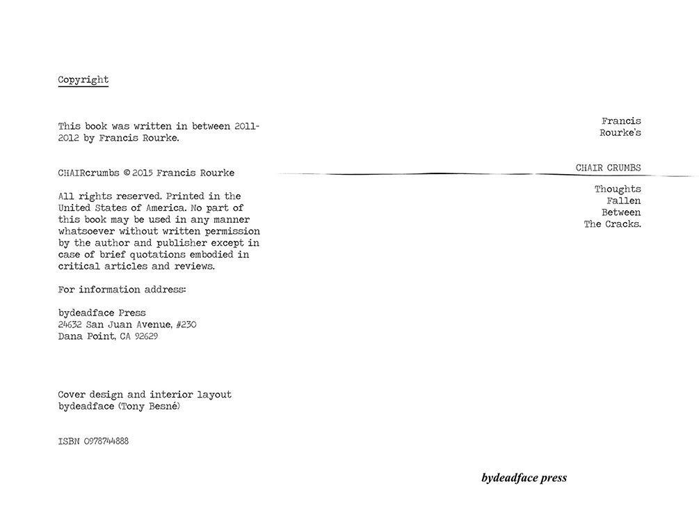 This entire book revolves around a chair and the writings that took place while sitting in its plush glory. Not just any chair, but CHAIR itself. A mirror image of perfection in comfort and style. An ideal center-point for any creative sphere of influence. A lot of the writings were written and reserved only for the time when sitting in CHAIR; some of it wasn't, but instead written about CHAIR in longing for that time to come again. CHAIR is real, it exists, and so do the feelings and thoughts that permeated its cushion while resting one's rumpus upon upholstery's royalty. As a matter of fact, I'm sitting in it now.